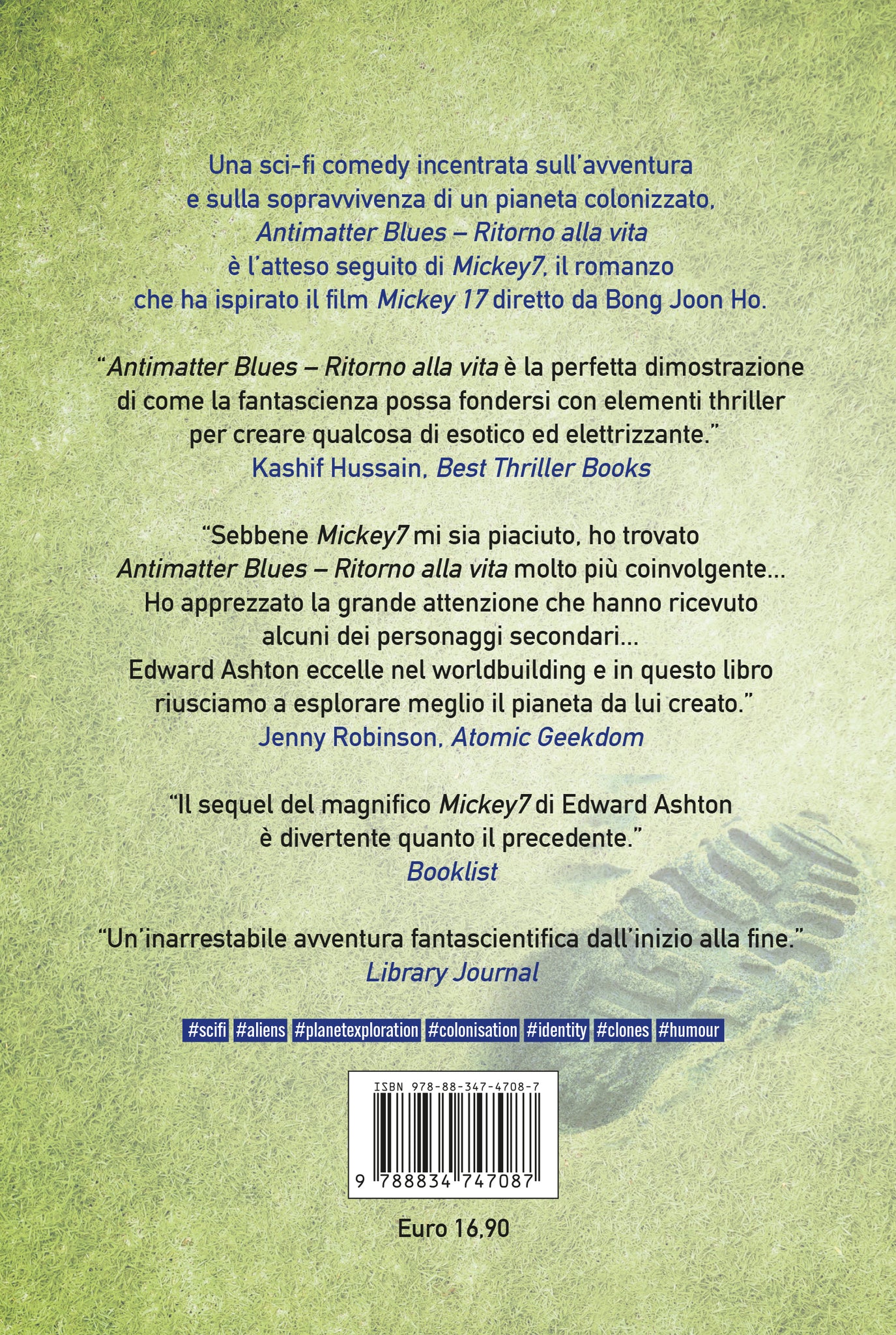“Sebbene Mickey7 mi sia piaciuto, ho trovato Antimatter Blues – Ritorno alla vita molto più coinvolgente... Ho apprezzato la grande attenzione che hanno ricevuto alcuni dei personaggi secondari... Edward Ashton eccelle nel worldbuilding e in questo libro riusciamo a esplorare meglio il pianeta da lui creato.” Jenny Robinson, Atomic Geekdom