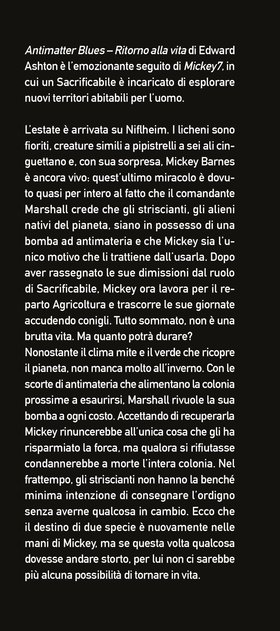 Antimatter Blues – Ritorno alla vita di Edward Ashton è l’emozionante seguito di Mickey7, in cui un Sacrificabile è incaricato di esplorare nuovi territori abitabili per l’uomo.